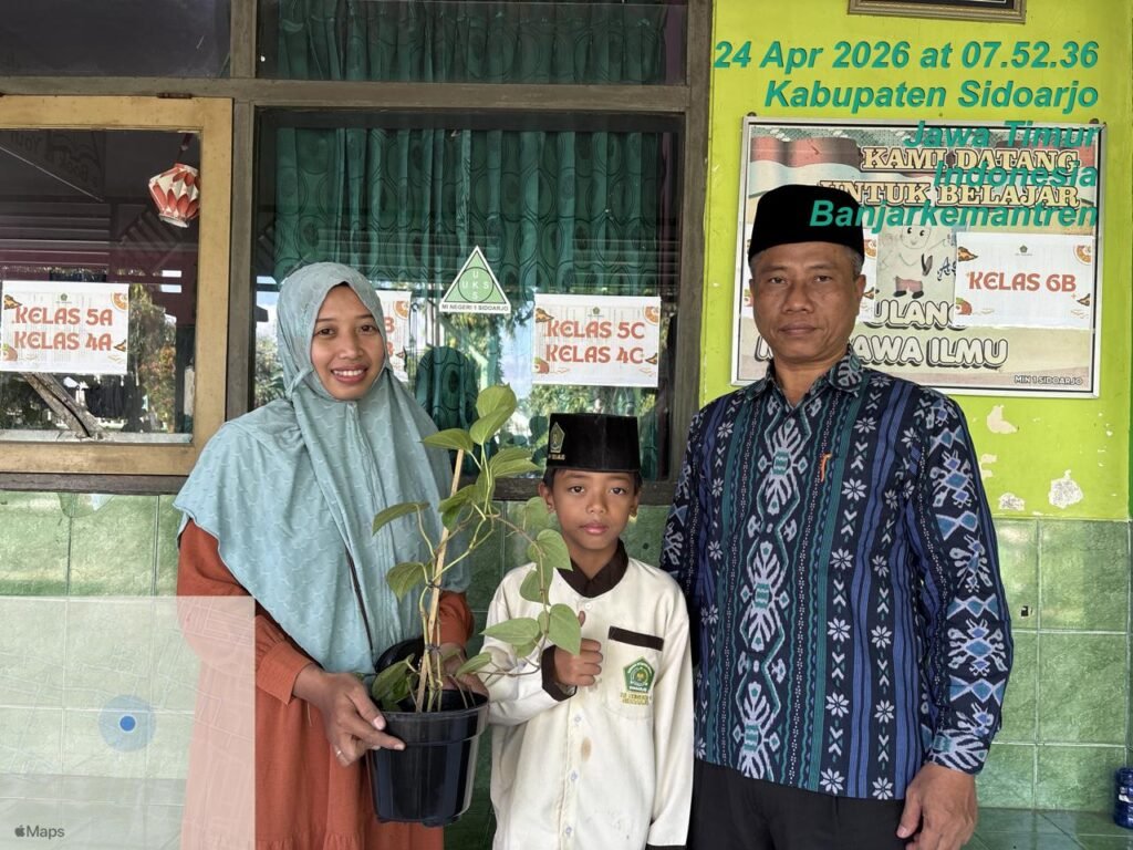 Suasana di MIN 1 Sidoarjo pada Jumat pagi (24/4/2026) tampak berbeda dari biasanya. Jika biasanya siswa datang membawa tas berisi buku, kali ini riuh rendah keceriaan terpancar saat ratusan siswa melangkah masuk gerbang dengan membawa berbagai jenis tanaman di tangan mereka.