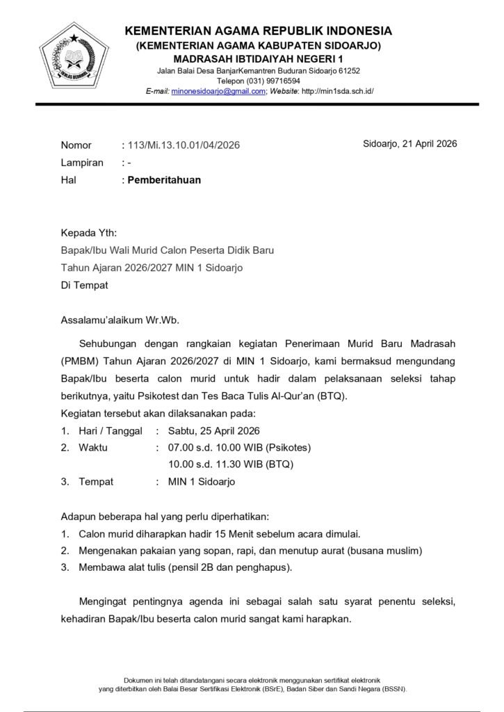 PMBM MIN1SDA: PENGUMUMAN HASIL PENERIMAAN CALON MURID BARU MIN 1 SIDOARJO 2026/2027 Humas Min1sda1 month ago 0