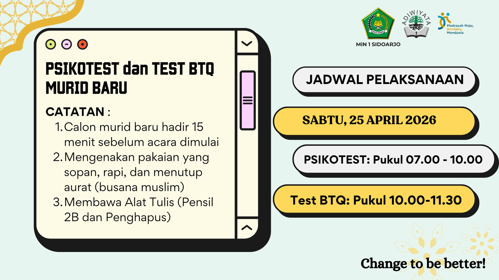 Kabar MadrasahPMBM MIN1SDA 2026/2027: PSIKOTEST dan TEST BTQ Humas Min1sda5 minutes ago9 seconds ago01 min mins Post navigation Previous: MOMENTUM TINGKATKAN MUTU MADRASAH: SEPULUH GURU MIN 1 SIDOARJO RESMI SANDANG PANGKAT BARU